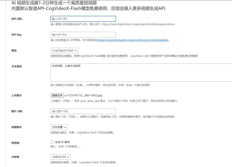 2025/2/15 更新版本(增加一个免费生成短视频功能,只需上传图片或输入文字描述,仅需 1 - 2 分钟即可生成一个高质量短视频,插件内置免费视频生成 API、模型,只需要根据后台说明填入 key 即可。获取 key 的链接也在后台,都是免费的)