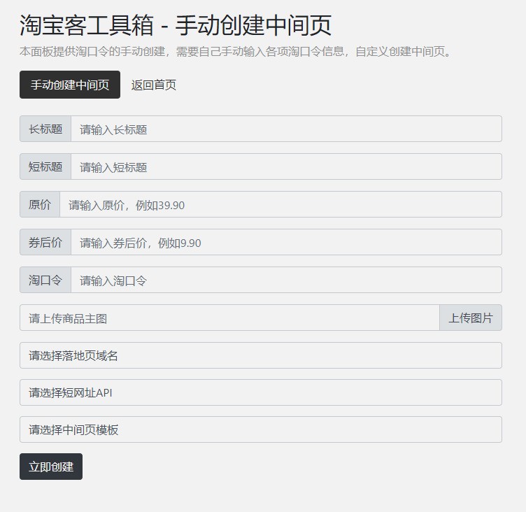 将需要创建的商品信息填写进去,选择落地页域名,选择生成短网址的API,选择落地页模板,即可一键生成,转换的淘口令也是你自己的淘口令,因为在一开始安装的时候,已经是授权淘宝,绑定PID了。