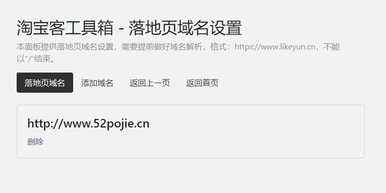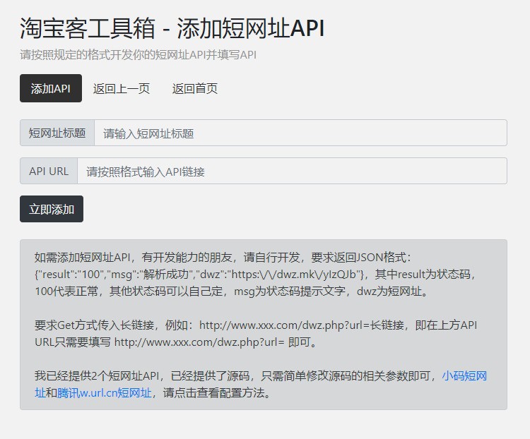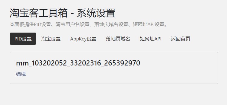 系统设置提供了绑定多个落地页域名,短网址API的配置,还有各种参数的设置,例如PID,AppKey,淘宝账号授权等。