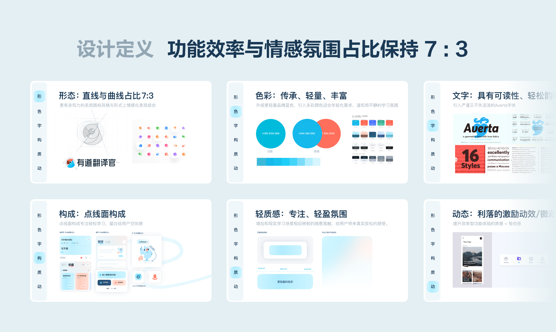 有道翻译官作为学习类产品,时刻考虑可用性、功能性,在产品设计过程中规划 信息/体验/艺术 三者的关系占比。翻译官的功能效率与情感氛围占比保持 7 : 3。